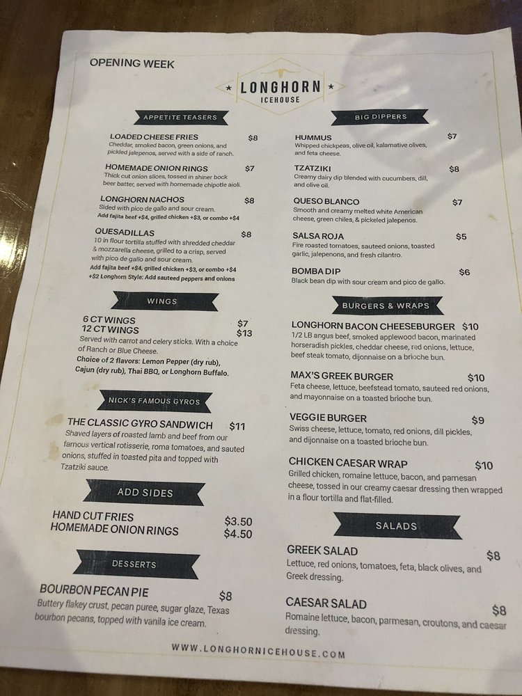 Longhorn Icehouse, located in Dallas, TX, offers a vibrant atmosphere with a range of amenities like outdoor seating, live music, and full bar service. Their menu features a variety of options, from salads like Bacon Avocado Caesar to appetizers like Fried Zucchini and Guacamole. The Texas Chili soup is a must-try for those craving a hearty dish. Customers praise the fun ambiance on game days and the excellent service provided by staff members like Renee. The cherry sour and signature dishes like mozzerella cheese sticks and onion rings are highlighted for their delicious flavors. Whether you're there for a game or just a night out, Longhorn Icehouse promises an enjoyable experience with great food and a welcoming environment.